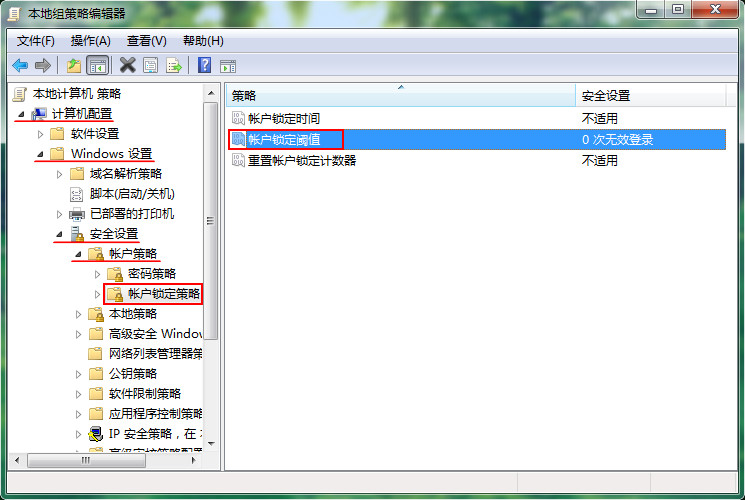 3、打開本地組策略編輯器,依次展開“計算機配置——Windows設(shè)置——安全設(shè)置——賬戶策略——賬戶鎖定策略”文件夾,接著在右側(cè)找到并雙擊“賬戶鎖定閥值”項,如圖所示: