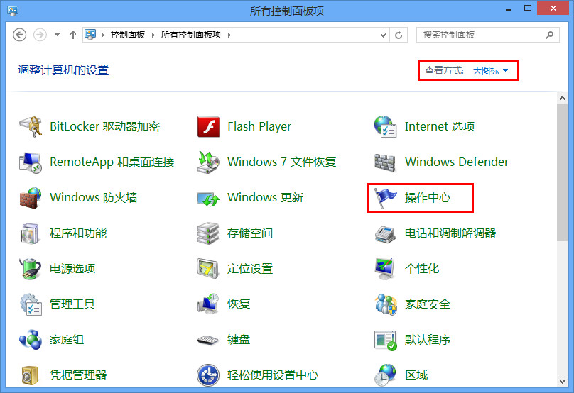 2、進(jìn)入到控制面板界面,把查看方式更改成“大圖標(biāo)”,然后點擊“操作中心”選項,如圖所示: