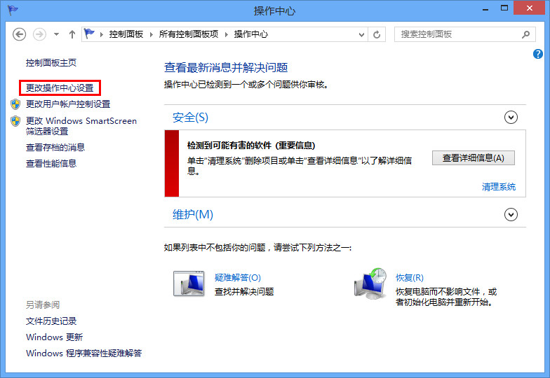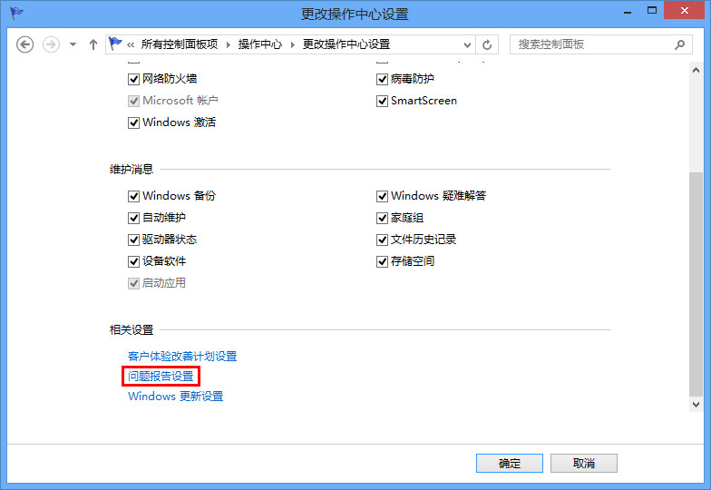 3、打開控制中心,點擊左側(cè)選項“更改操作中心設(shè)置”,然后下拉尋找“問題報告設(shè)置”項,如圖所示: