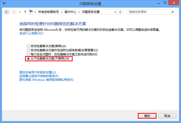 4、從問題報告設(shè)置窗口采用“從不檢查解決方案”選項,完成后直接按下“確定”按鈕進(jìn)行保存,如圖所示: