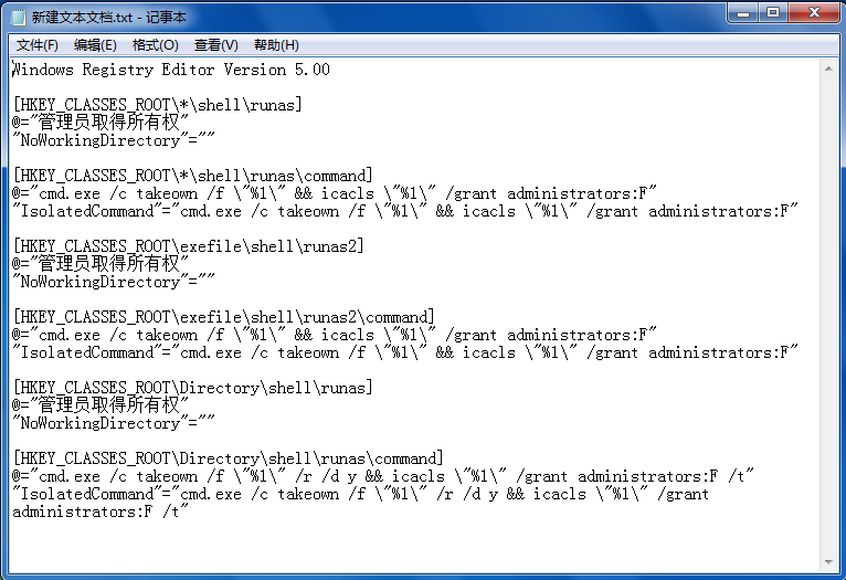 @="cmd.exe /c takeown /f \"%1\" && icacls \"%1\" /grant administrators:F"