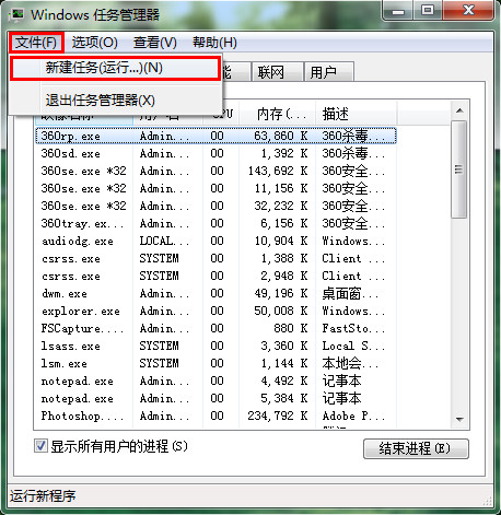 1、按下Ctrl+Alt+Delete組合鍵進(jìn)入任務(wù)管理器,接著選擇“文件——新建任務(wù)(運(yùn)行)”選項(xiàng),如下圖所示: