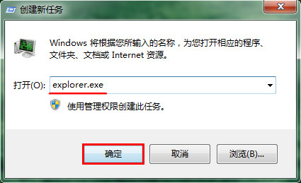 2、打開創(chuàng)建新任務(wù)窗口,直接輸入“explorer.exe”命令,按下“確定”按鈕,如下圖所示:
