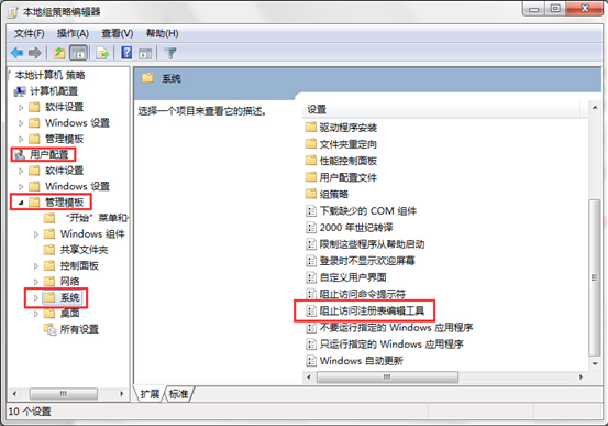 二、接著在本地組策略編輯器窗口中依次展開“用戶配置→管理模塊→系統(tǒng)”選項,接著在右側(cè)的設(shè)置選項列表中,找到“阻止訪問注冊表編輯工具”雙擊打開。如下圖所示: