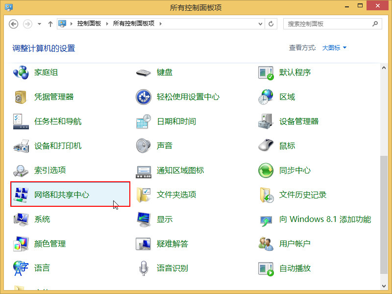 2、從所有控制面板項(xiàng)找到“網(wǎng)絡(luò)和共享中心”選項(xiàng),如下圖所示: