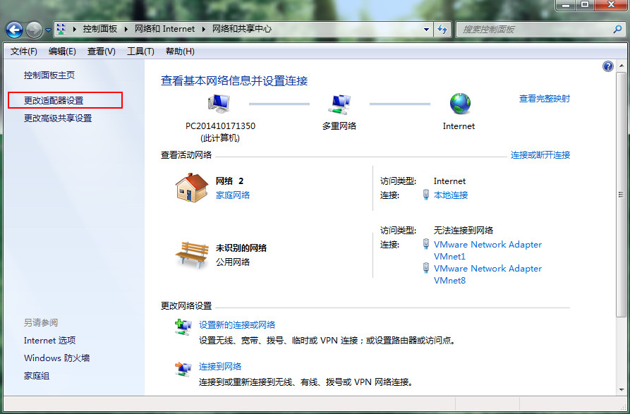 3、進(jìn)入網(wǎng)絡(luò)和共享中心后,選擇左上方“更改適配器設(shè)置”,如下圖所示: