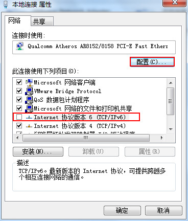4、選擇本地連接的屬性,然后勾選掉“Internet協(xié)議版本6(TCP/IPv6)”選項(xiàng),接著點(diǎn)擊“配置”按鈕,如下圖所示: