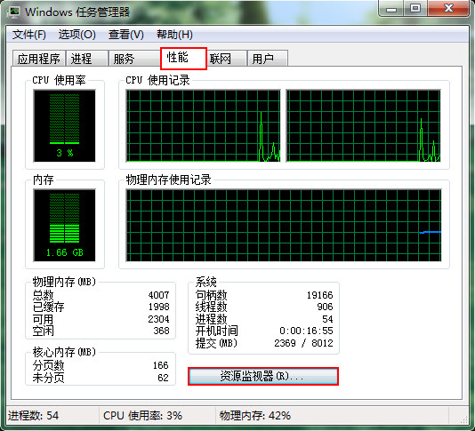 2、選擇任務(wù)管理器中“性能”頁面,點(diǎn)擊“資源監(jiān)視器”,如下圖所示: