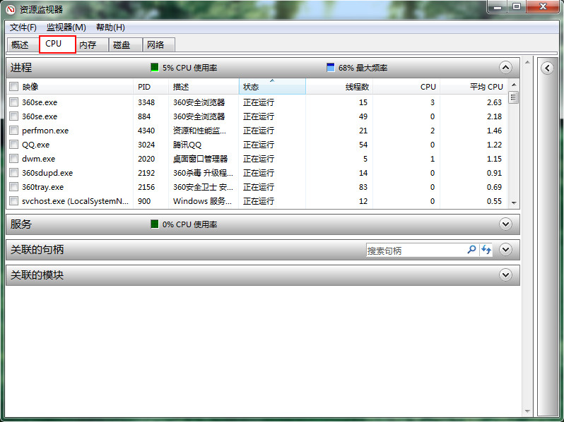 3、從資源監(jiān)視器中切換到“CPU”欄目,可以看到正在運(yùn)行的各個(gè)程序,如下圖所示: