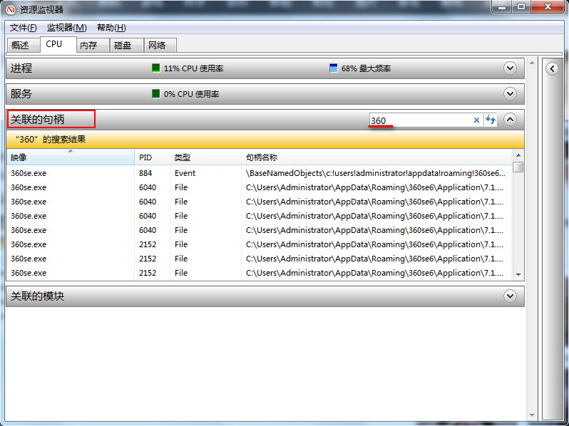 4、在“關(guān)聯(lián)的句柄”中輸入所需要刪除的文件或文件夾名稱,列表就會搜索出相關(guān)文件(例如:搜索360),如下圖所示: