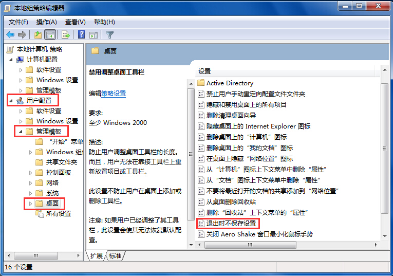 2、在本地策略組編輯器中,依次展開“用戶配置--管理模板--桌面”,在右側(cè)界面中找到并打開“退出時(shí)不保存設(shè)置”選項(xiàng),如圖所示: