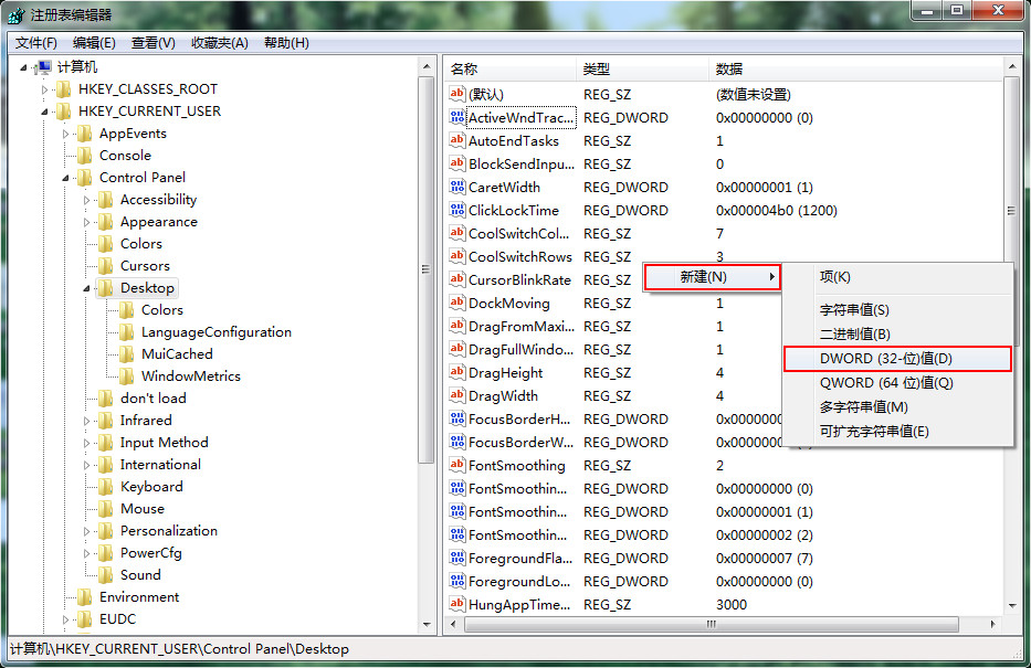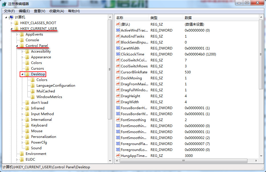 3、依次展開“HKEY_CURRENT_USER\Control Panel\Desktop”選項(xiàng),然后在右側(cè)查看是否有“WaitToKillAppTimeout”項(xiàng),發(fā)現(xiàn)有該項(xiàng)就將其刪除,如下圖所示: