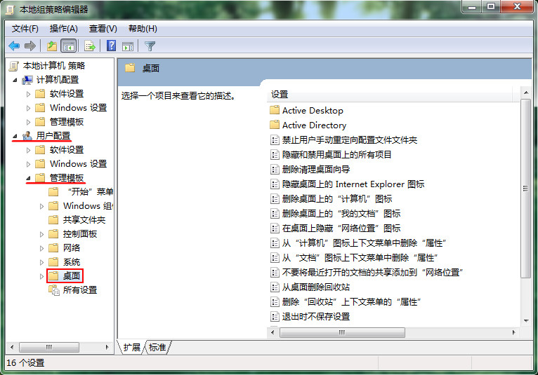3、進(jìn)入本地組策略編輯器,依次展開“用戶配置--管理模板--桌面”選項(xiàng),如下圖所示:
