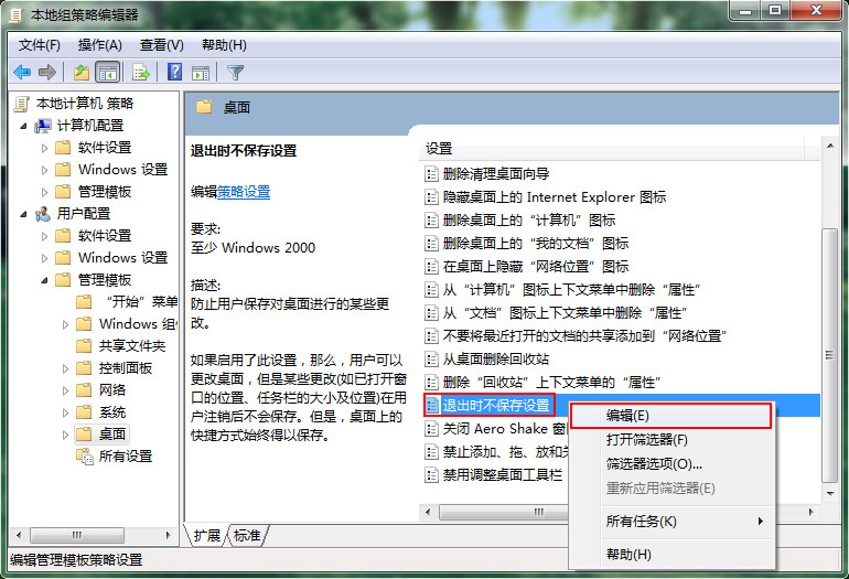 4、從窗口右側(cè)找到“退出時(shí)不保存設(shè)置”選項(xiàng),然后鼠標(biāo)右鍵點(diǎn)擊選取“編輯”項(xiàng),如下圖所示: