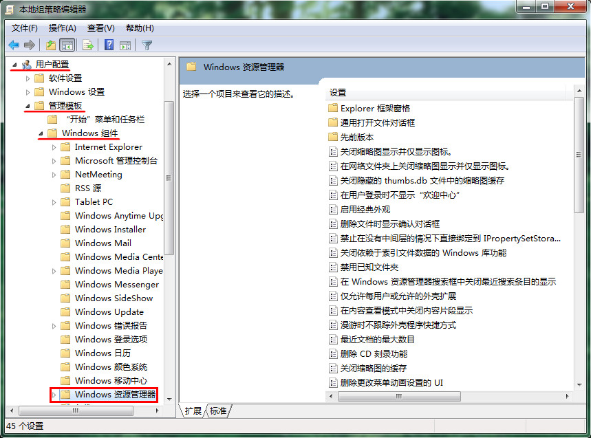 3、進(jìn)入本地組策略編輯器,依次展開“用戶配置--管理模板--Windows組件--Windows資源管理器”文件夾,如下圖所示: