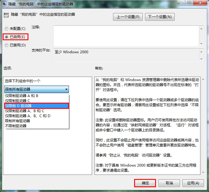 5、進(jìn)入設(shè)置窗口點擊“已啟用”,然后選取“僅限制D驅(qū)動器”選項,完成后按下“確定”按鈕,如下圖所示: